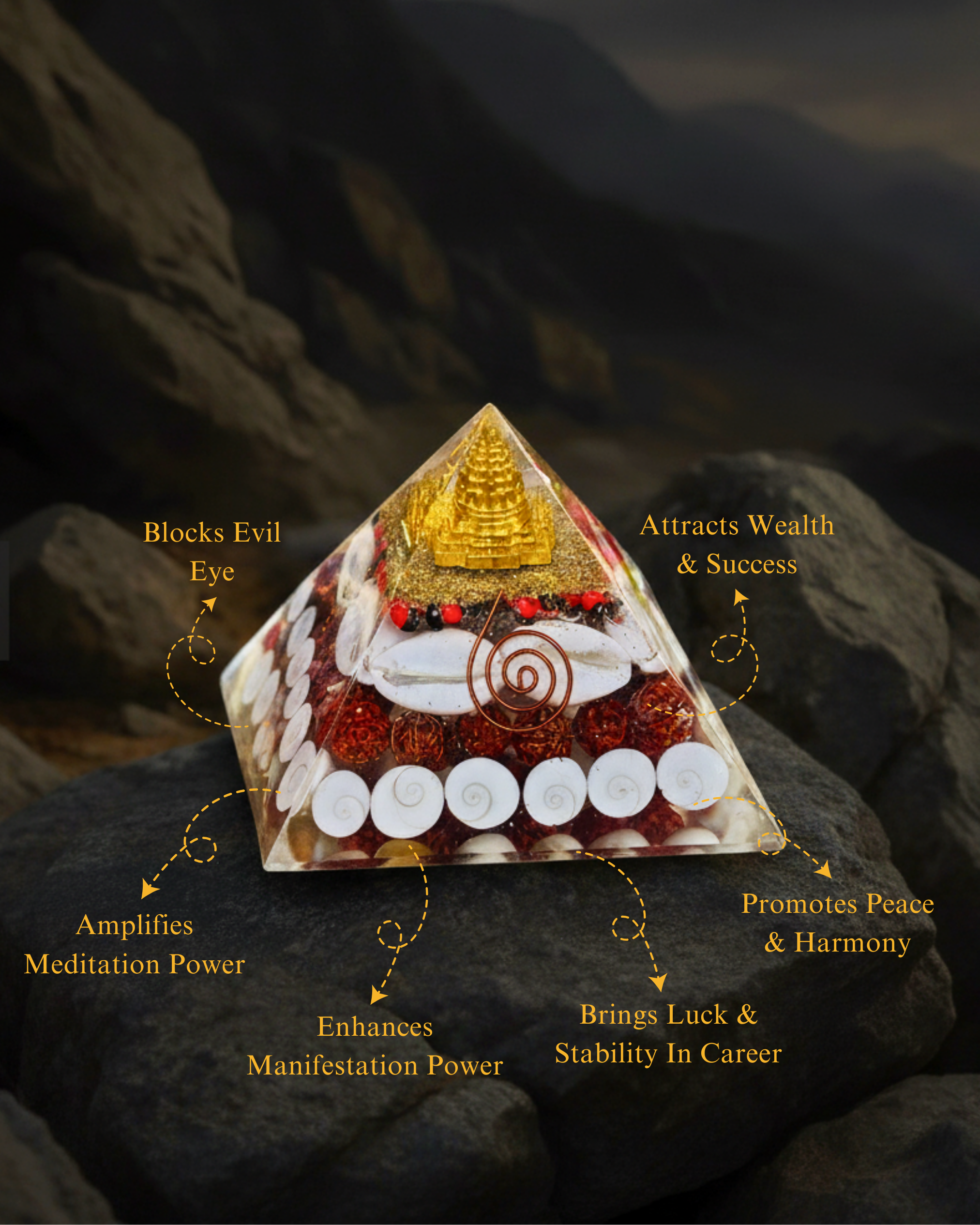 The Laxmi Shri Yantra Pyramid brings together the stabilizing geometry of a pyramid with the sacred symbolism of the Shri Yantra, traditionally associated with abundance, balance, and higher alignment.